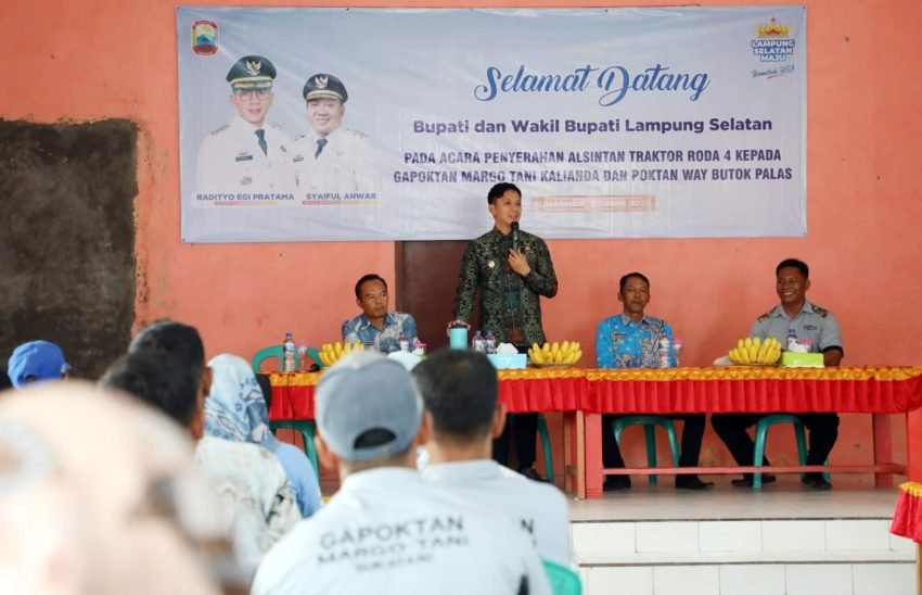 Dalam rangka memperkuat ketahanan pangan dan meningkatkan produktivitas pertanian, Bupati Lampung Selatan, Radityo Egi Pratama (Egi), menyerahkan bantuan alat dan mesin pertanian (alsintan) secara simbolis kepada para petani di dua wilayah: Gapoktan Margo Tani, Desa Sukatani, Kecamatan Kalianda, dan Kelompok Tani Way Butok, Desa Sukaraja, Kecamatan Palas Kabupaten Lampung Selatan.