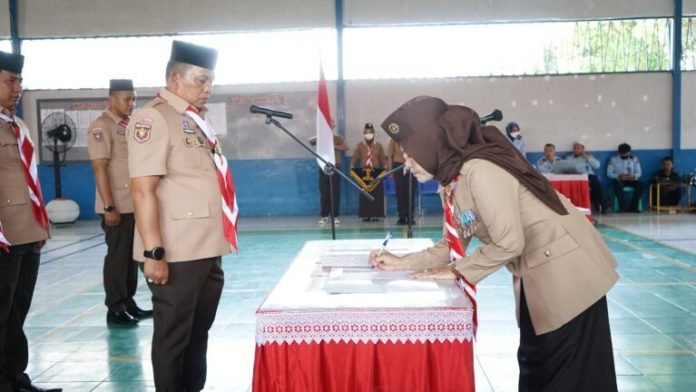 Ketua Kwartir Cabang Gerakan Pramuka Lampung Selatan Hj. Winarni Nanang Ermanto melantik Majelis Pembimbing Gugus Depan 12.167 Lapas Narkotika Kelas II A Bandar Lampung, di aula Lapas setempat pada Selasa (1/11/2022).
