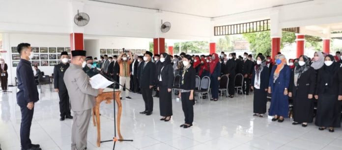 Bupati Lampung Selatan H. Nanang Ermanto melantik dan mengambil sumpah janji 195 Pejabat Fungsional hasil penyetaraan jabatan di lingkungan pemerintah daerah di aula sebuku, rumah dinas bupati setempat, pada Jum’at (31/12/2021).