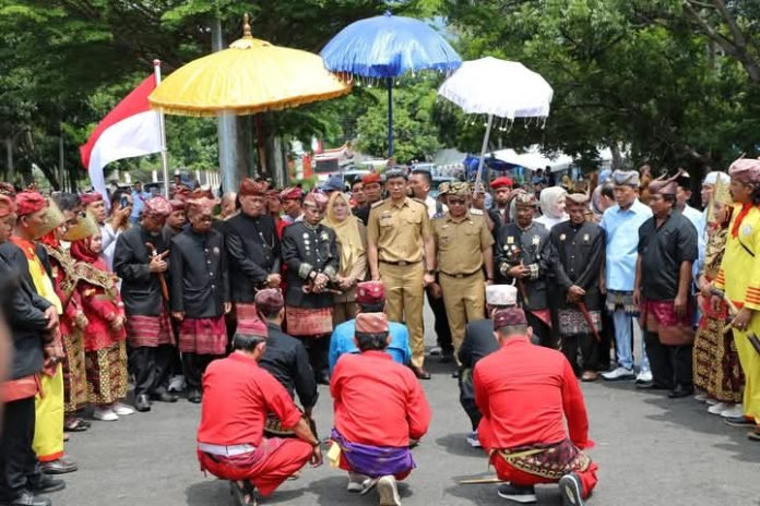 Bupati dan Wakil Bupati Lampung Selatan, Radityo Egi Pratama dan Muhammad Syaiful Anwar (Egi-Syaiful) mendapat penyambutan prosesi adat Saibain Lima Marga Lampung Selatan saat tiba di kantor bupati setempat, Senin (3/3/2025).
